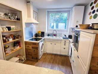 Au rez-de-chaussée, profitez d’une pièce de vie chaleureuse avec une petite cuisine aménagée et équipée, parfaite pour vos repas du quotidien. Vous y trouverez également une buanderie pratique et des WC indépendants.